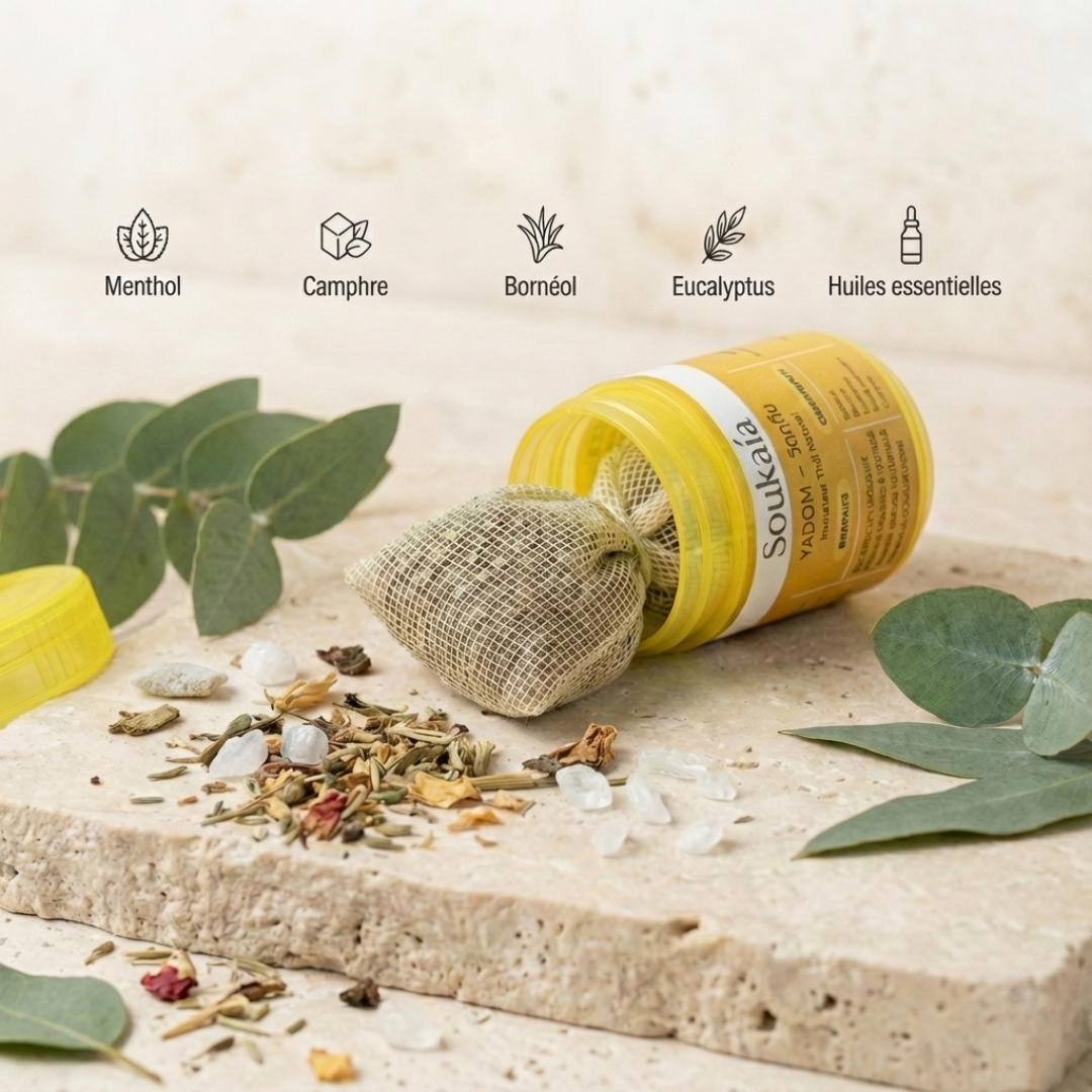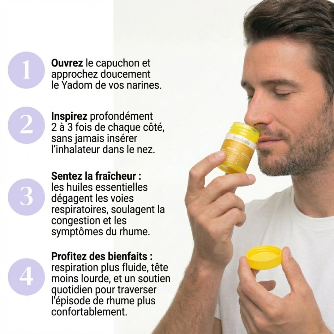Le Yadom agit par inhalation directe grâce à une combinaison d’huiles essentielles naturelles comme le menthol, le camphre, l’eucalyptus et le bornéol.